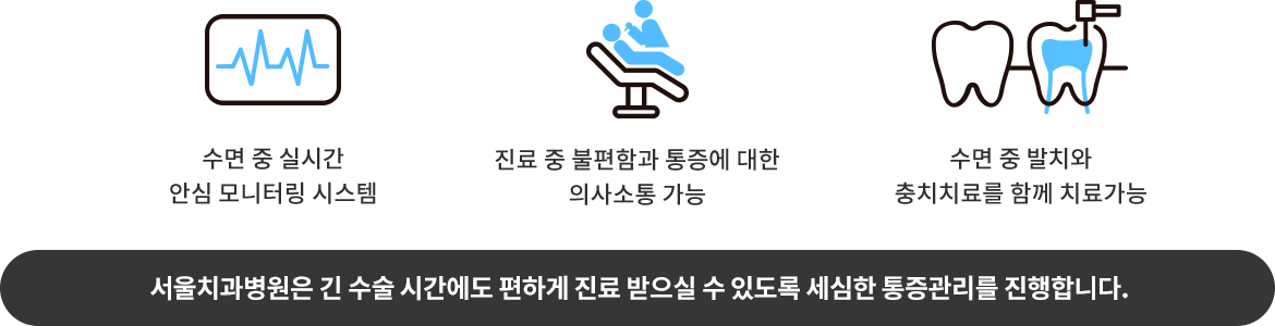 서울치과병원에서는 일반적인 전신마취가 아닌 기수면 상태와 같은 수면요법으로 장시간 입을 벌리기 어렵거나