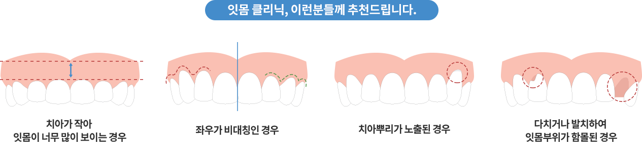 가만히 있어도 보이는 잇몸, 웃거나 말할 때 과도하게 보이는 잇몸, 라인이 삐뚤빼뚤한 잇몸 등